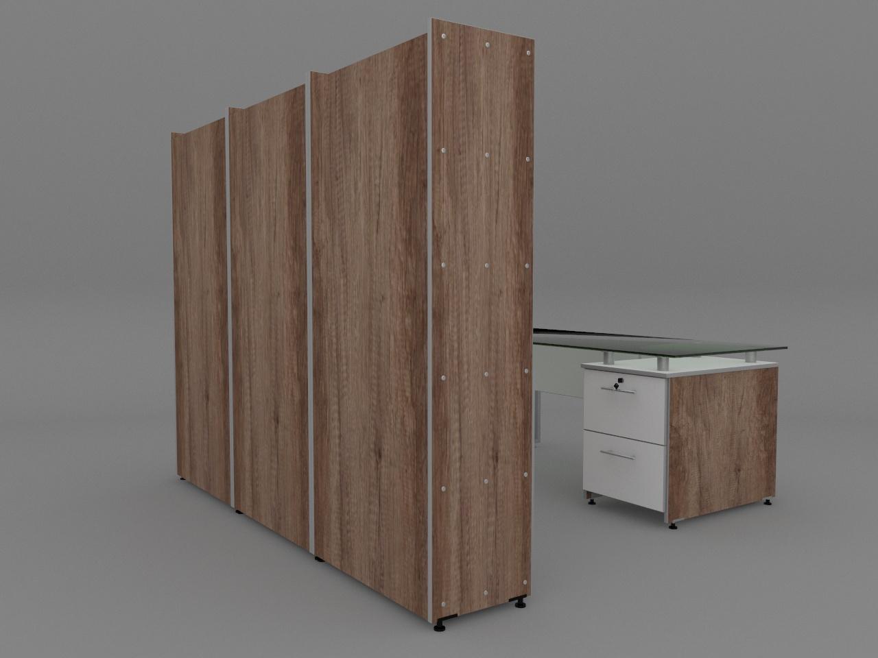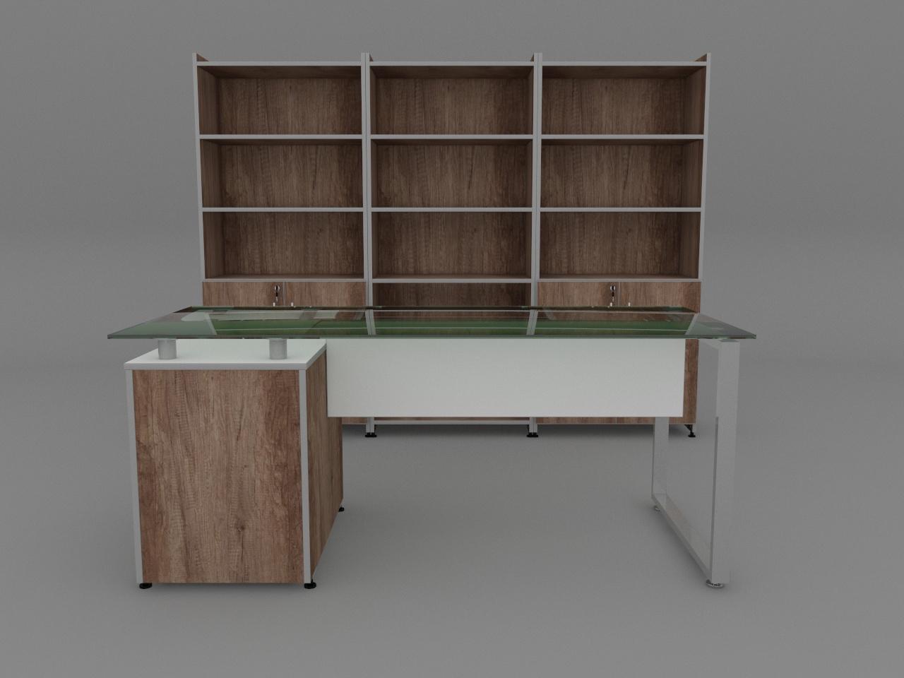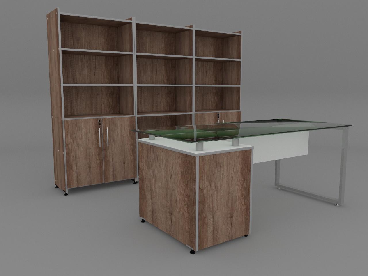 conjunto que se compone de escritorio ejecutivo y 3 libreros. fabricados en madera industrializada melaminizada por termofusion y cantos vinilizados. escritorio ejecutivo kudako plus de 180 x 80 cm, con cubierta de cristal templado de 12 mm de espesor con cantos pulidos brillantes; 2 pedestales tipo soporte, cada uno con una gaveta archivadora y una gaveta utilera, cada una con correderas de extension completa embalinadas, frente de gavetas de 16 mm de espesor, cuerpo de gavetas de lamina negra cal 22 con acabado en pintura al horno con laterales de 28 mm de espesor, con jaladera mod. tiger de 20 cm. pedestal cuenta con cerradura de cierre simultaneo ademas de 2 soportes de aluminio redondo macizo de 3 plg atornillable en un lado, para fijar y soportar cubierta de cristal. faldon central de 19 mm de espesor, fijado al interior de los pedestales. 2 libreros con puertas abatibles inferiores de panel de 16 mm de espesor, ambas con jaladera mod. tiger de 20 cm, con cerradura; todo el libre