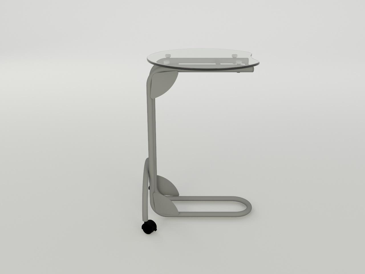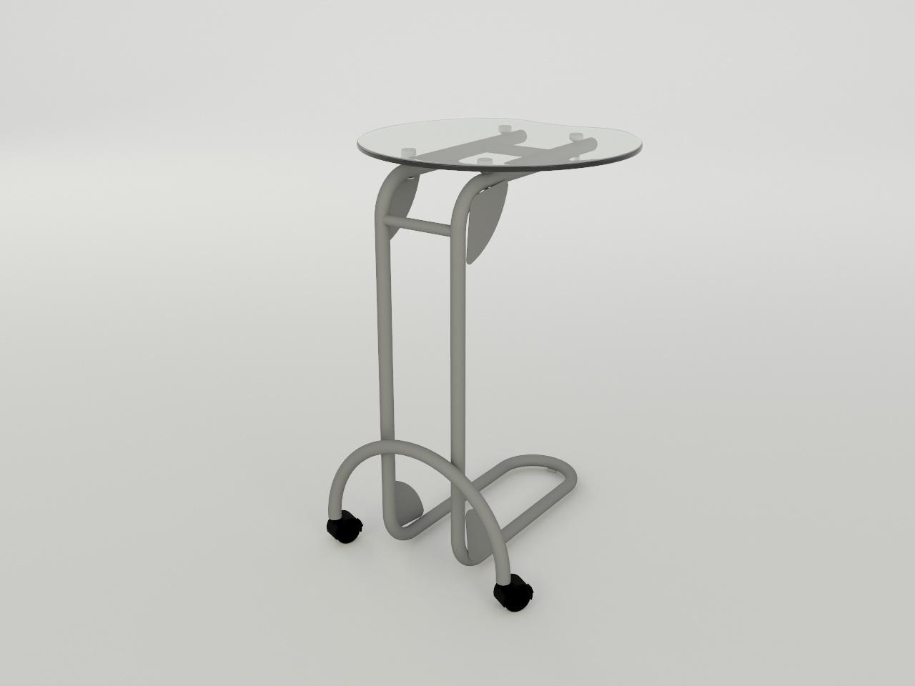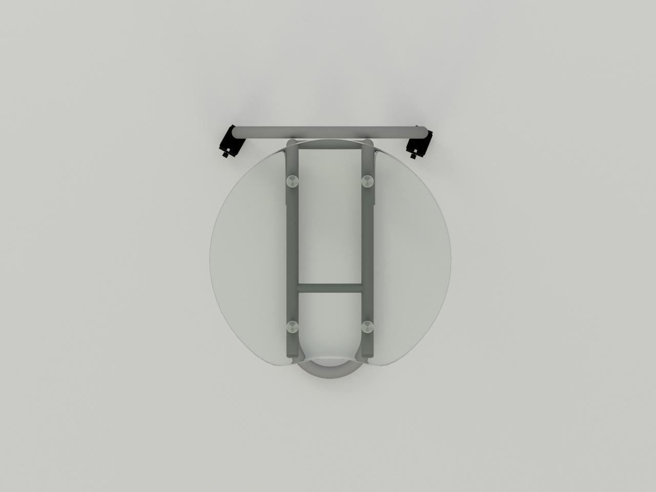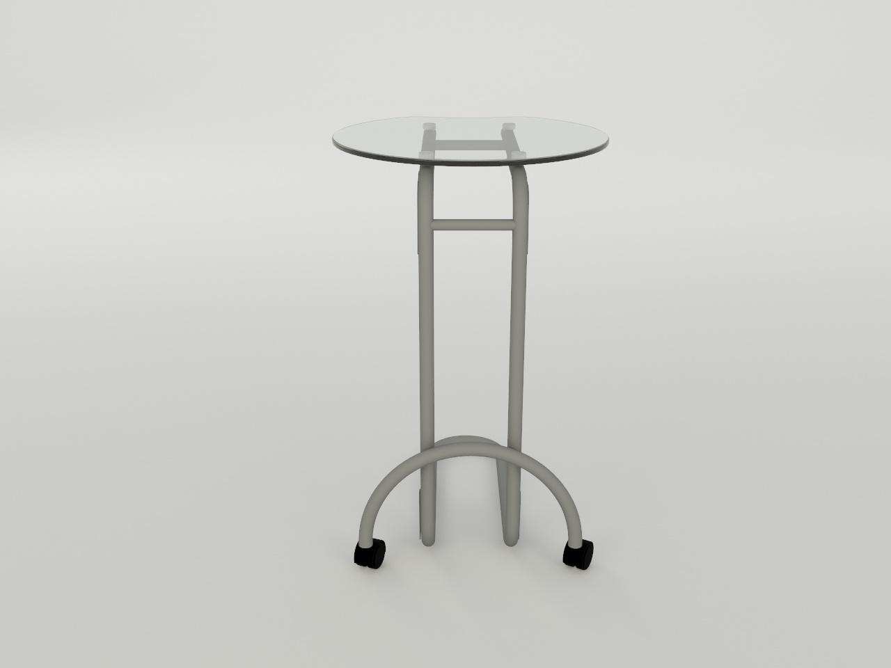 con una estructura metalica de tubo redondo de 1 plg cal. 18, formado por una base en forma c con un arco con ruedas al frente, 2 placas de refuerzo superior de lamina cal. 14 con 4 perforaciones y 4 placas de lamina cal. 20 en los angulos; todo con acabado en pintura al horno previo tratamiento de fosfatizado y sellado organico. incluye 4 herrajes de aluminio de 1 plg de diametro. incluye cubierta de cristal claro de 9 mm de espesor redonda de 50 cm de diametro y cantos pulidos brillantes.