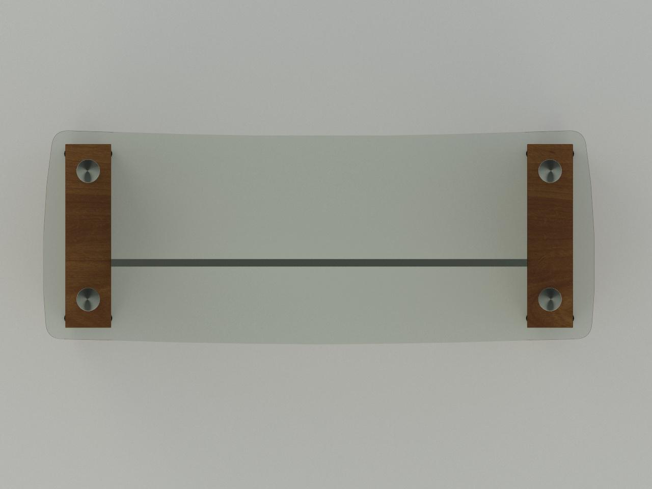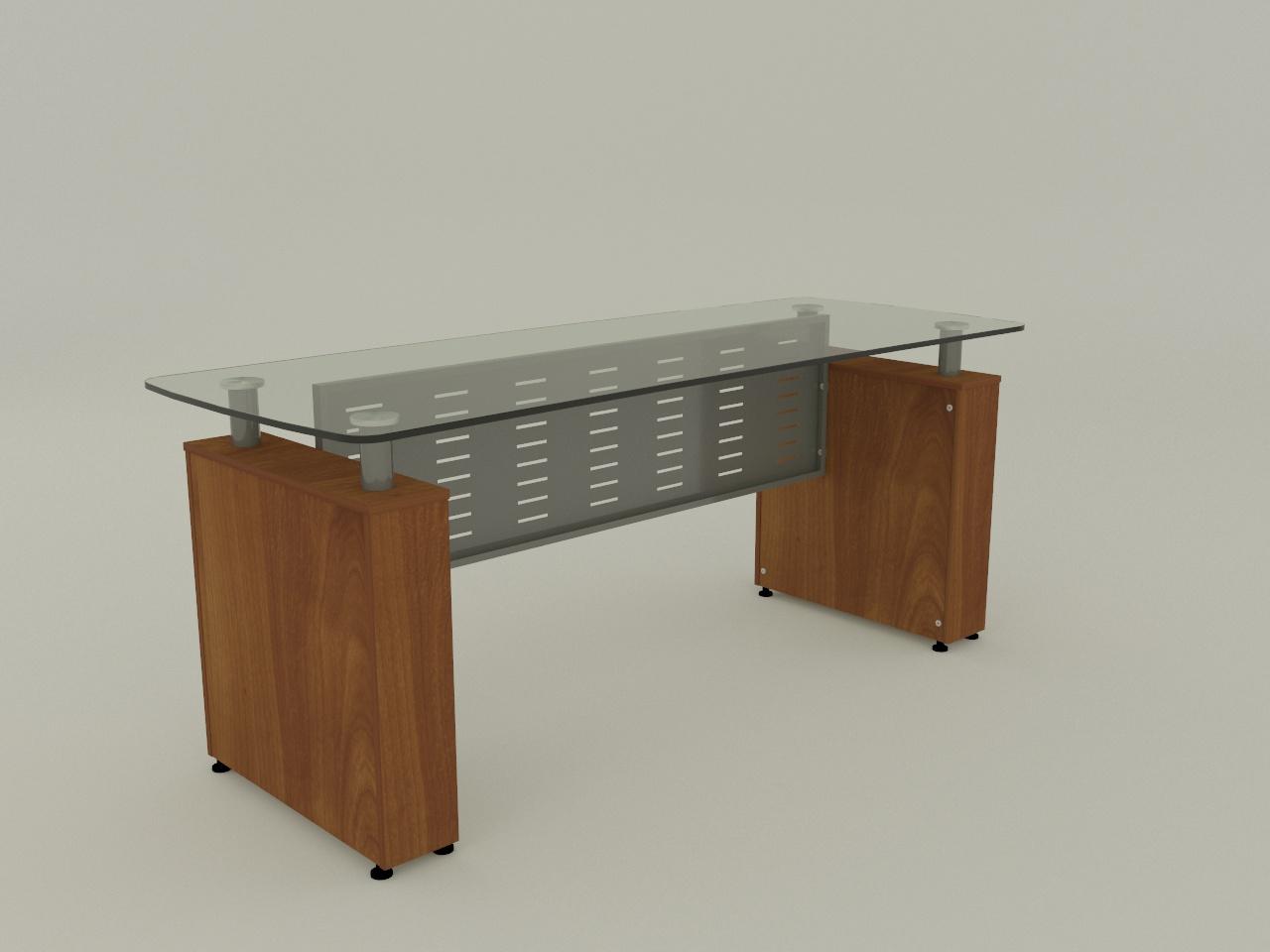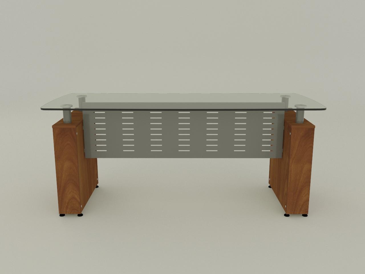 escritorio ejecutivo con cubierta de cristal claro de 12mm de espesor: 180 x 70 cm con cortes curvos ergonomicos, cpb en todo su perimetro en aristas con perfil cuarto bocel. cuenta con 2 soportes, cada uno de base aramada con panelart de 16mm de espesor con cantos de pvc termoadheridos de 2 mm de espesor, con refuerzos inferiores de 28mm para colocar niveladores para ajuste de altura. se incluye 2 soportes de tubo redondo de 2 plg con tapon de aluminio macizo de 3 plg de diametro, ademas de una tuerca hexagonal de 1/4 plg. con acabado en pintura al horno, previa limpieza, proceso de fosfatizacion y sellado organico anticorrosivo. faldon de lamina negra cal 22 con perforaciones decorativas de 3 plg x 1/4 plg distribuidas en el faldon, sujetado con 4 tornillos y 4 tuercas, acabado con pintura en polvo epoxi polyester al horno, previa limpieza, proceso de fosfatizacion y sellado organico anticorrosivo.