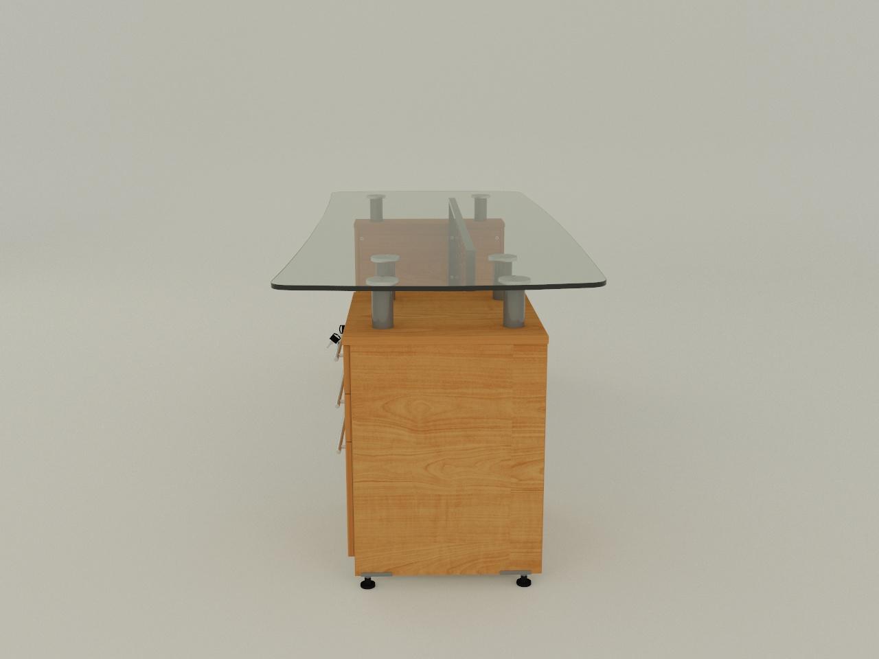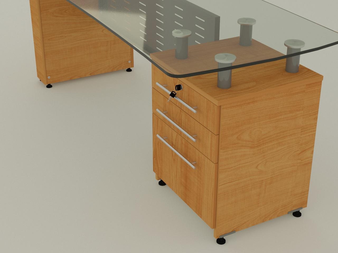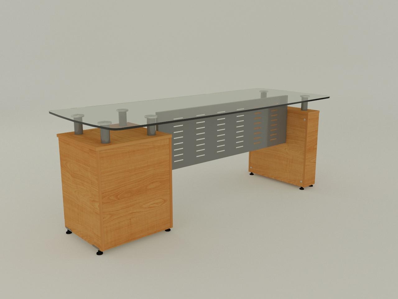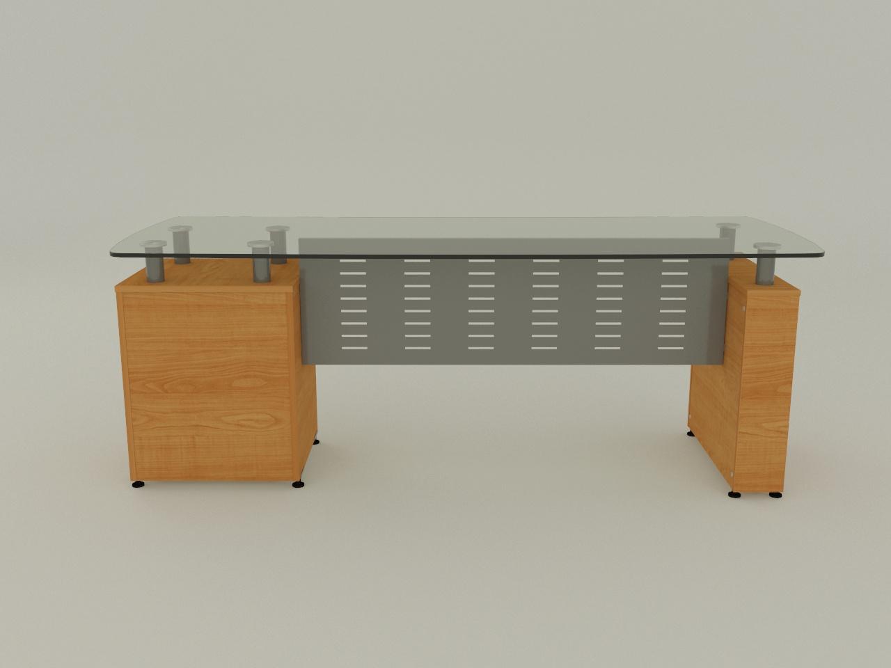 escritorio ejecutivo con cubierta de cristal claro de 12mm de espesor: 200 x 80 cm con cortes curvos ergonomicos, cpb en todo su perimetro en aristas con perfil cuarto bocel. cuenta con 1 soporte, de base aramada con panelart de 16mm de espesor con cantos de pvc termoadheridos de 2 mm de espesor, con refuerzos inferiores de 28mm para colocar niveladores para ajuste de altura. se incluye 2 soportes de tubo redondo de 2 plg con tapon de aluminio macizo de 3 plg de diametro, ademas de una tuerca hexagonal de 1/4 plg. con acabado en pintura al horno, previa limpieza, proceso de fosfatizacion y sellado organico anticorrosivo. faldon de lamina negra cal 22 con perforaciones decorativas de 3 plg x 1/4 plg distribuidas en el faldon, sujetado con 4 tornillos y 4 tuercas, acabado con pintura en polvo epoxi polyester al horno, previa limpieza, proceso de fosfatizacion y sellado organico anticorrosivo. incluye 1 cajonera pedestal con 2 gavetas utileros status y 1 gaveta archivador status tamaño o