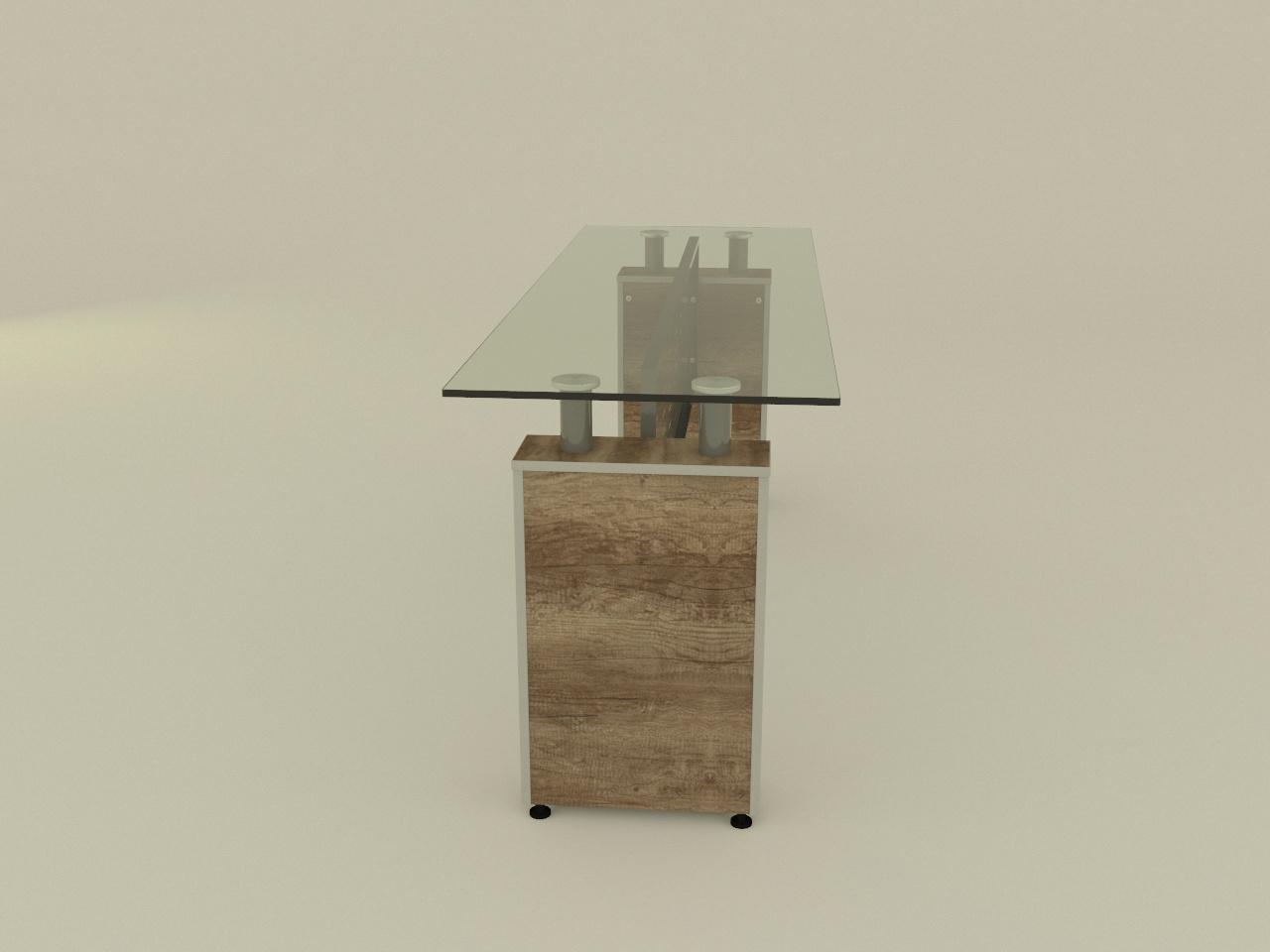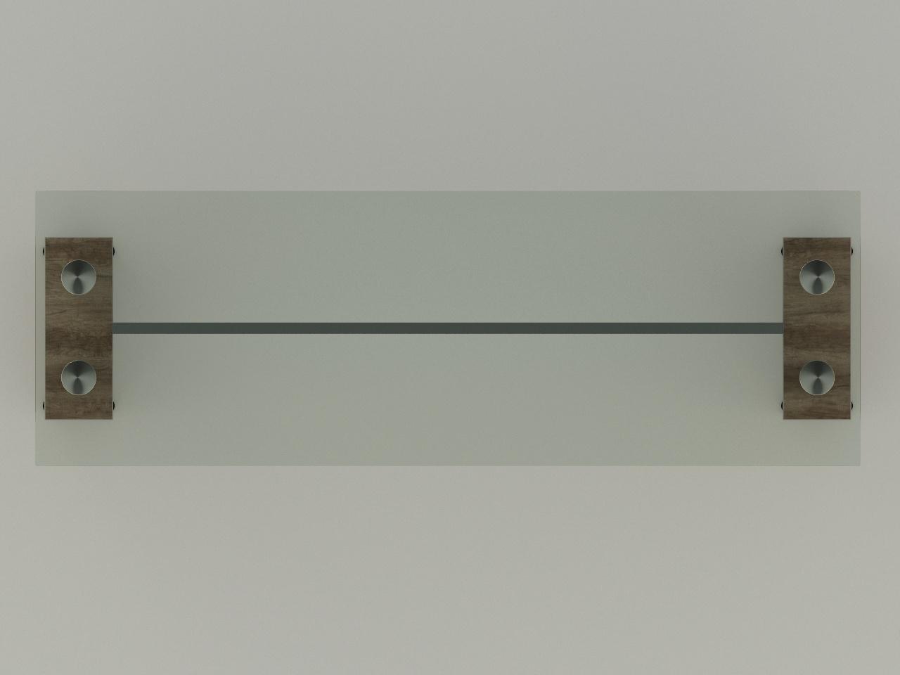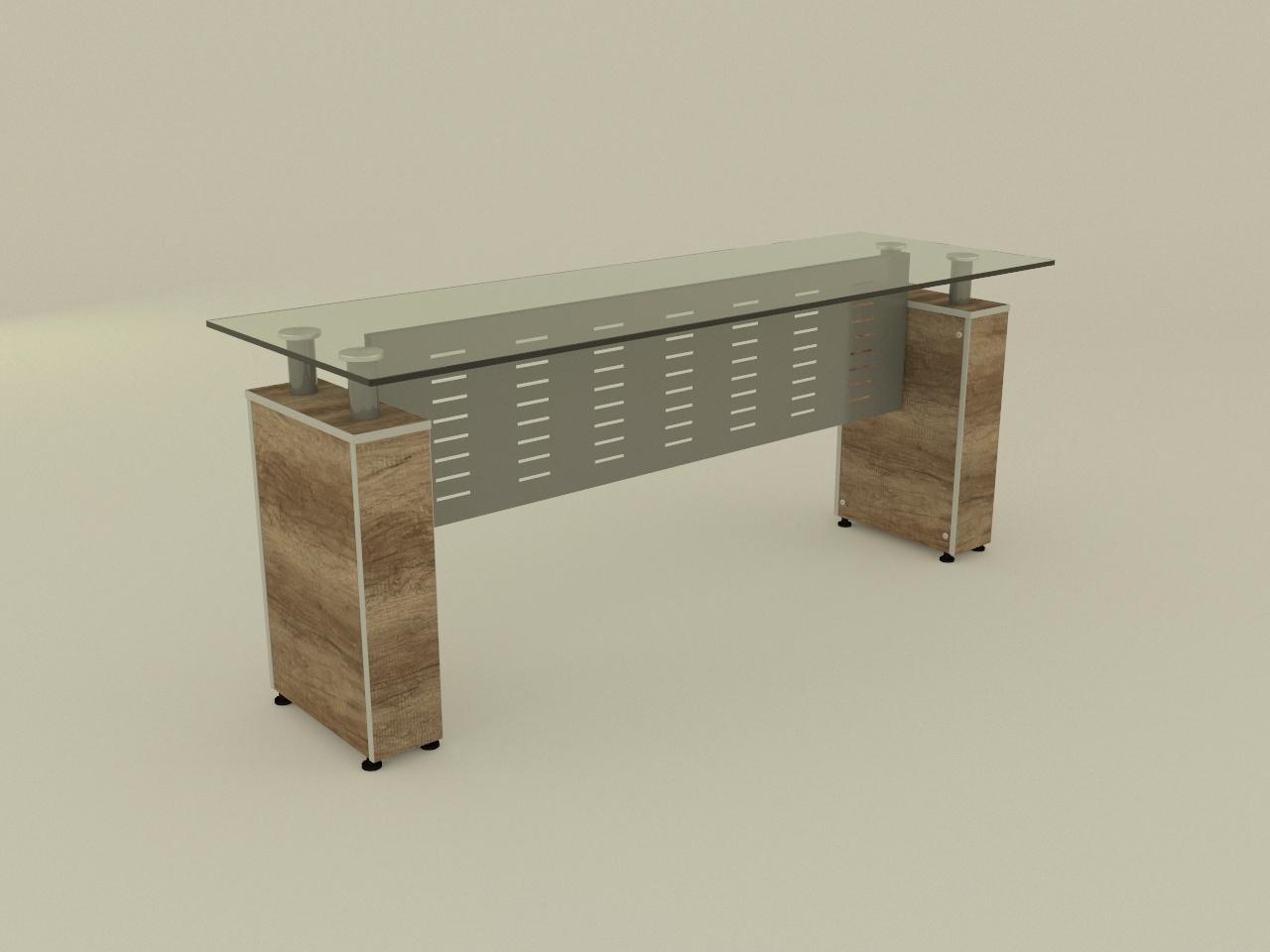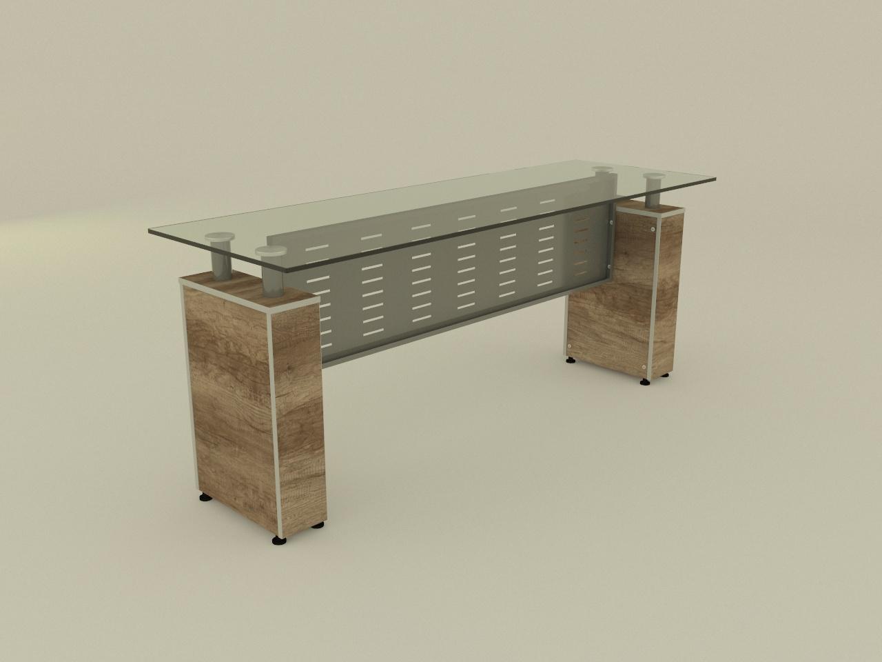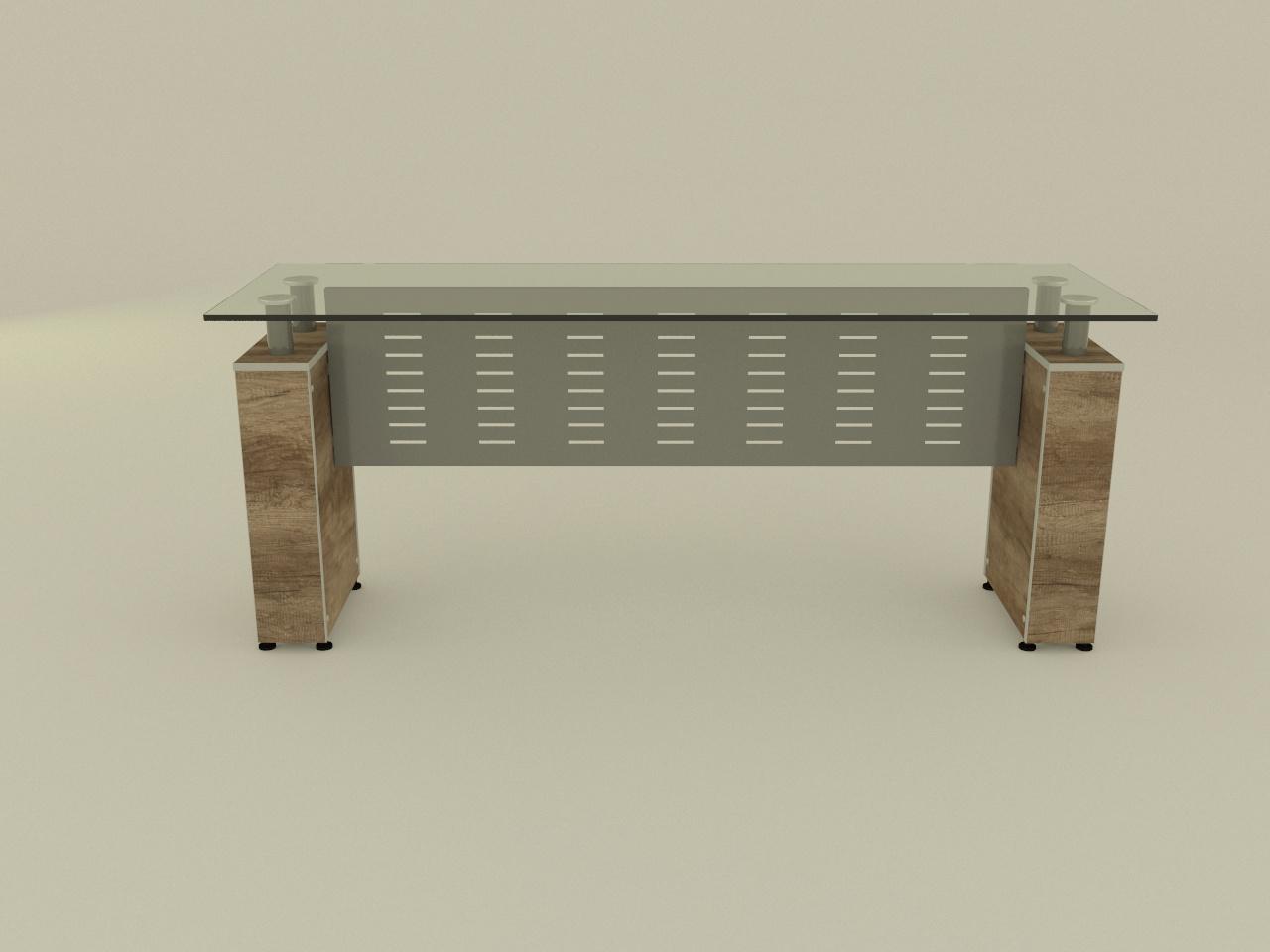 con cubierta de cristal claro de 12mm de espesor de 180 x 60 cm, canto pulido brillante en todo su perimetro en aristas con perfil cuarto bocel. cuenta con 2 soportes, cada uno de base armada con panelart de 16mm de espesor con cantos de pvc termoadheridos de 2 mm de espesor, con refuerzos inferiores de 28 mm para colocar niveladores para ajuste de altura. se incluye 2 soportes de tubo redondo de 2 plg con tapon de aluminio macizo de 3 plg de diametro, ademas de una tuerca hexagonal de 1/4 plg. con acabado en pintura al horno, previa limpieza, proceso de fosfatizacion y sellado organico. faldon de lamina negra cal 20 con perforaciones decorativas de 3 plg x 1/4 plg distribuidas en el faldon, sujetado con 4 tornillos y 4 tuercas, acabado con pintura al horno, previa limpieza, proceso de fosfatizacion y sellado organico.