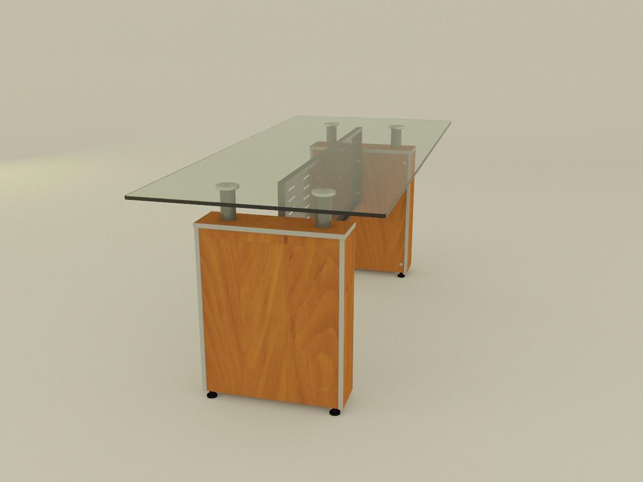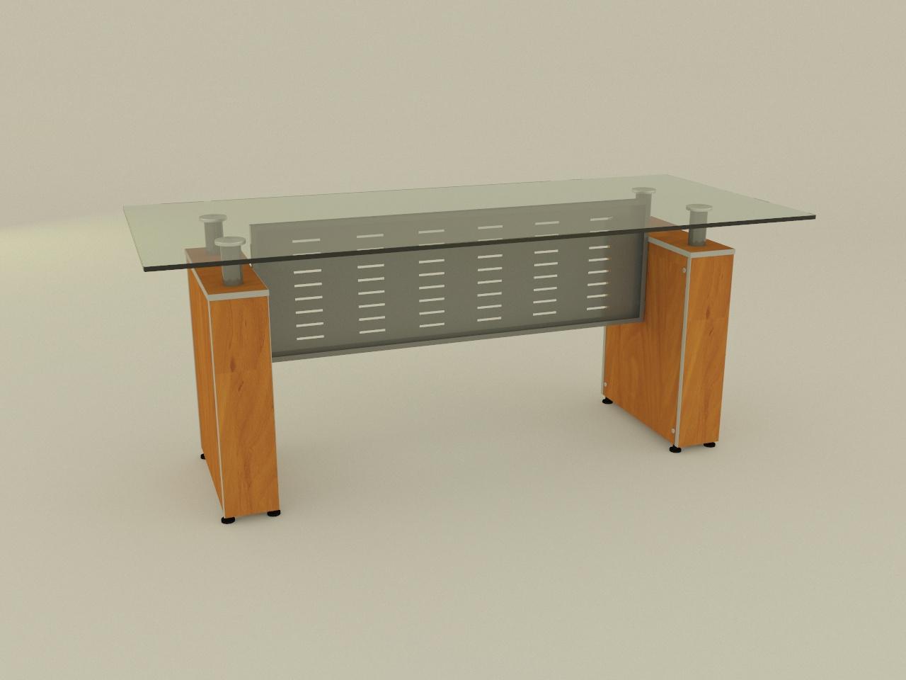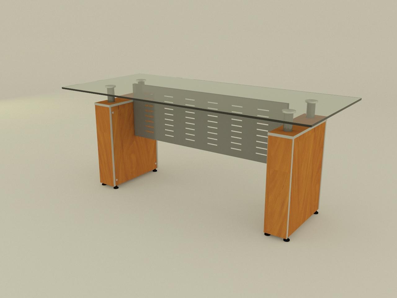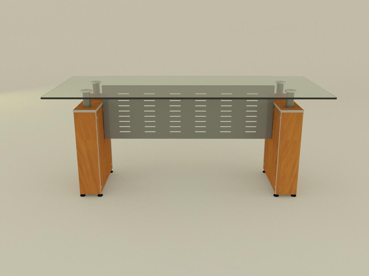 con cubierta de cristal claro de 12 mm de espesor de 180 x 80 cm, cantos pulidos brillantes en todo su perimetro en aristas con perfil cuarto de bocel. cuenta con 2 soportes, cada uno de base armada con panelart de 16 mm de espesor con cantos de pvc termoadheridos de 2 mm de espesor, con refuerzos inferiores en 28 mm para colocar niveladores para ajuste de altura. se incluye 2 soportes de tubo redondo de 2 plg con tapon de aluminio macizo de 3 plg de diametro, ademas de una tuerca hexagonal de 1/4 plg. con acabado en pintura al horno, previa limpieza, proceso de fosfatizacion y sellado organico. faldon de lamina negra cal 20 con perforaciones decorativas de 3 plg x 1/4 plg distribuidas en el faldon, sujetado con 4 tornillos y 4 tuercas, acabado en pintura al horno previa limpieza, proceso de fosfatizacion y sellado organico.