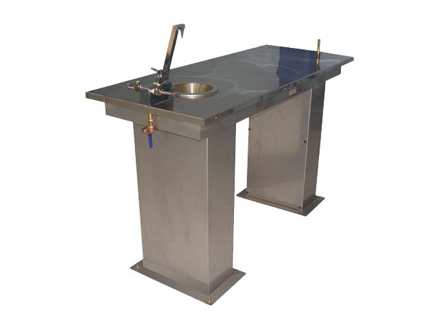 estructura de metalica con 2 soportes de lamina cal. 16 cada uno con un placa base de cal. 12 para anclar a piso (opcional); marco inferior y faldon perimetral de lamina cal. 18 con orificios para salida de contacto electrico. acabado con pintura epoxi-poliester al horno previo tratamiento de fosfatizado y sello organico, la cubierta de acero inoxidable cal. 20, con 1 llave tipo cuello de ganso y llaves para toma de agua, gas y escudillo.