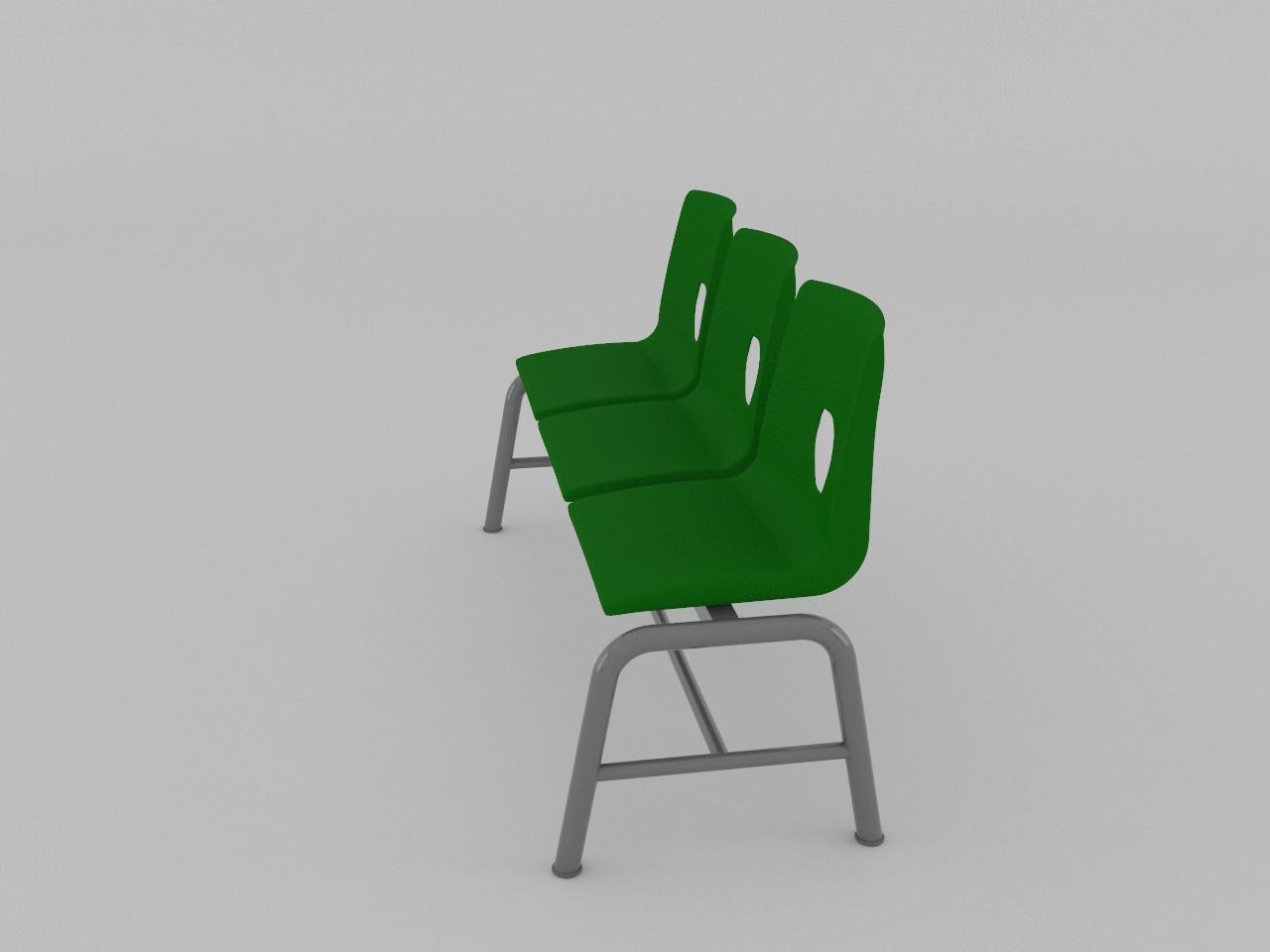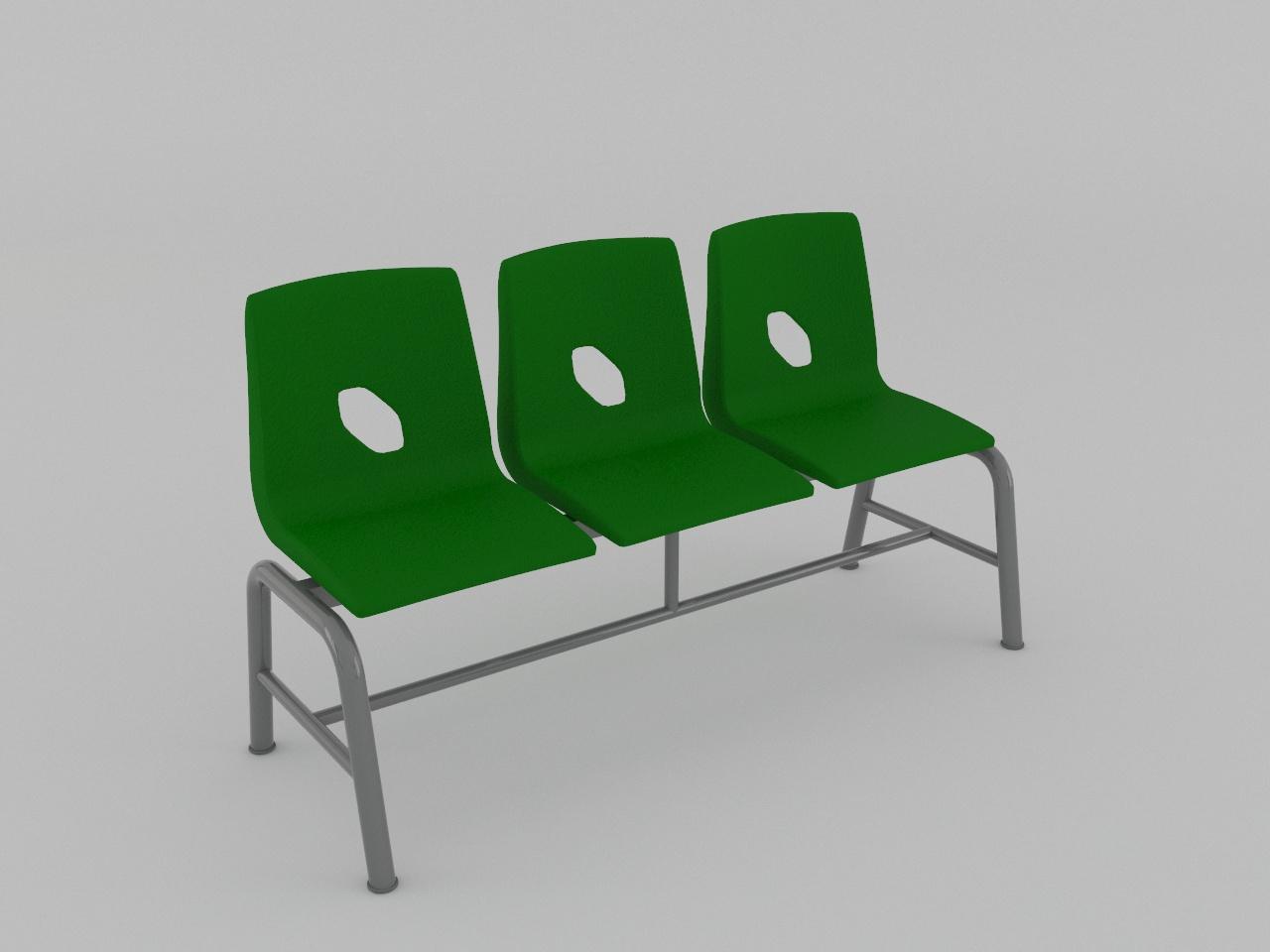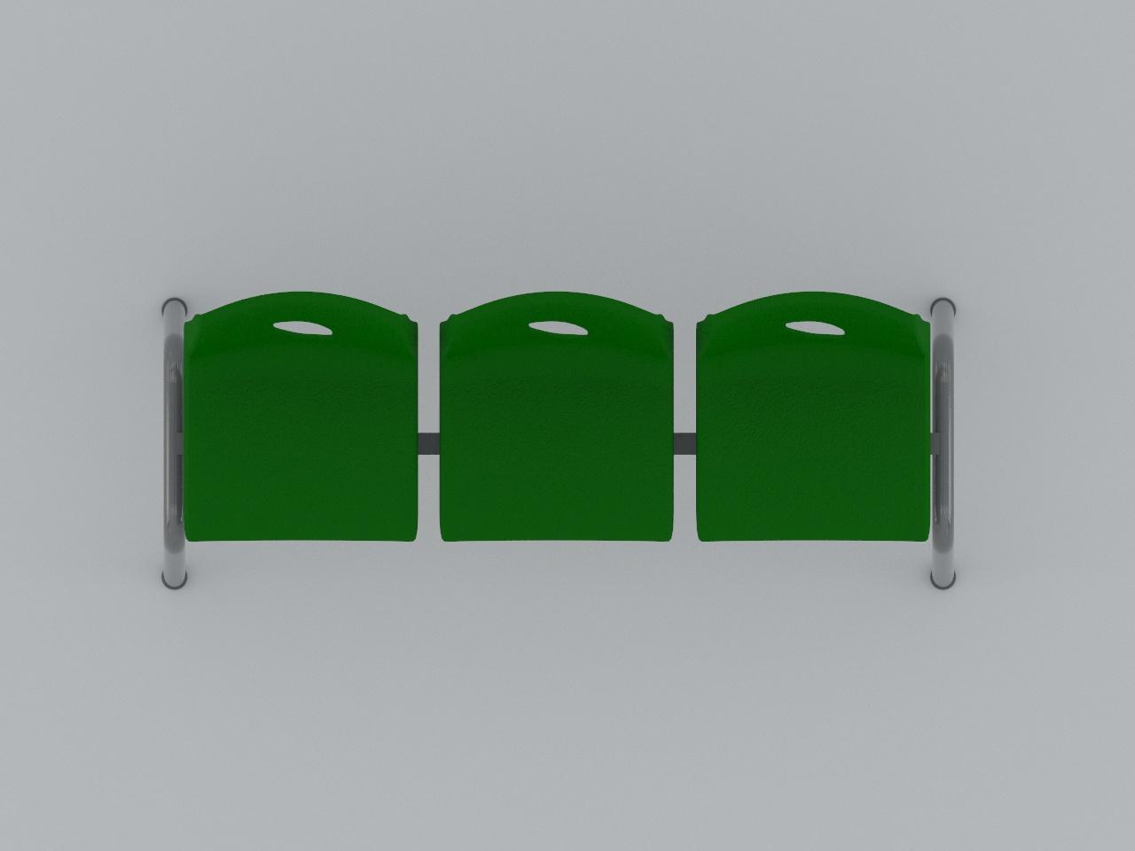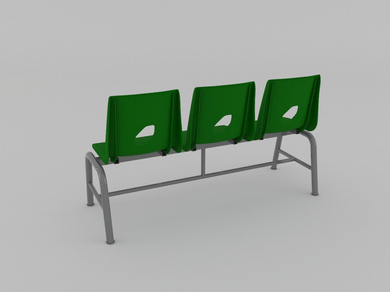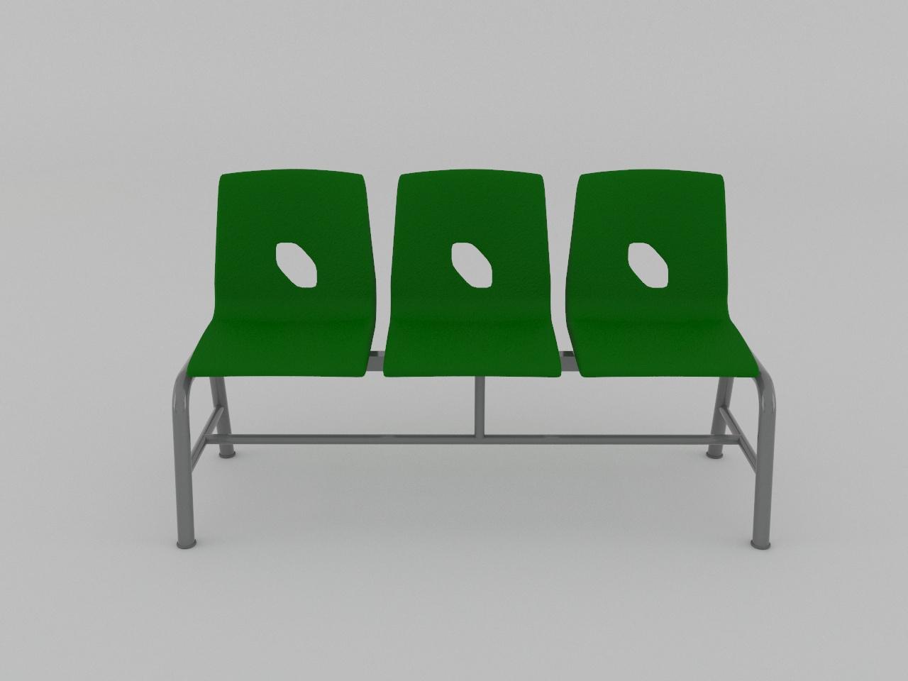 fabricada con 2 soportes en forma de arco de tubo redondo de 1 1/2 plg cal 18 con regatones plasticos, travesaño superior para asientos de tubo cuadrado reforzado de 1 1/2 plg cal 14, travesaño inferior y travesaño vertical para union de soportes de tubo redondo de 1 plg cal 18, refuerzo de arco de pata de tubo redondo de 1 plg cal 18. cuenta con 6 refuerzos de tubo cuadrado de 1 plg cal 18 para asiento de plastico. todo con acabado en pintura al horno. cuenta con 3 asientos de polipropileno en color verde, sujetados con remaches.